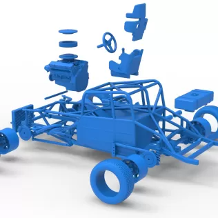 The model consists of parts: Air intake, Body, Engine main part, Front rims, Front tires, Gear shifter, Left compressor part, Left exhaust part, Rear rims, Rear tires, Right compressor part, Right exhaust part, Rod, Seat, Steering wheel, Tank, Wheelie bar pin, Wheelie bar wheel.