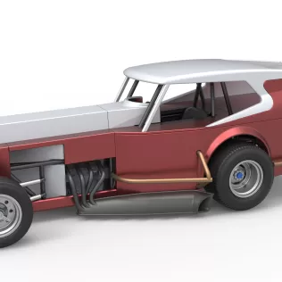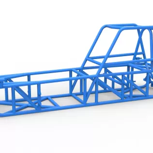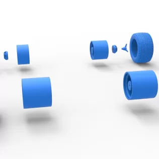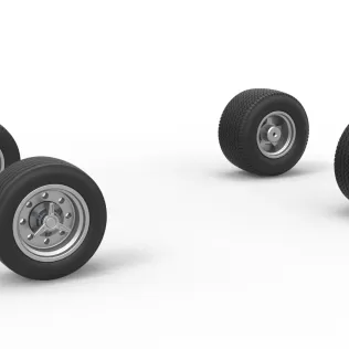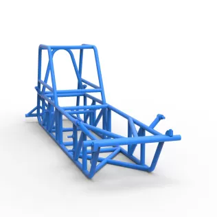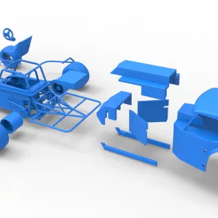 The model consists of parts: Air filter cap, Air filter, Centerlock nuts, Engine, Frame, Front left rim, Front left tire, Front right rim, Front right tire, Front rim hubs, Hood, Left bumper, Left exhaust, Left inner plate, Left side plate, Nose, Radiator, Rear left tire, Rear right tire, Rear rims, Right bumper, Right exhaust, Right inner plate, Right side plate, Seat, Shell, Shifter, Steering rod, Steering wheel, Tank.